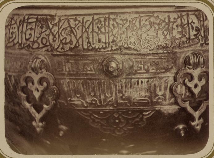 | Keywords: Syr-Darya Oblast. City of Turkestan. Beginning of the Inscription Bordering the Exterior of the Cauldron Located in the Tomb of Saint Sultan Akhmed Iassavi WDL3593.png Artwork ru Богаевский иколай Владими ович 1843 1912 гг fr Bogaevskii Nikolaï V 1843-1912 en Bogaevskii Nikolai V 1843-1912 zh 亚历山大·L· ,1840-1888 年 pt Bogaevskii Nikolai V 1843-1912 ar بوغافسكي، نيكولاي ف ، 1843-1912 es Bogaevskii Nikolai V 1843-1912 ru Сы да ьинская область Го од Ту кестан ачало надписи окаймляющей на ужную сто ону котла находящегося в г обнице святого султана Ахмеда Яссави fr Oblast de Syr-Darya Ville de Turkestan Début de l'inscription bordant l'extérieur du chaudron situé dans le sépulcre du vénérable sultan Akhmed Iassavi en Syr-Darya Oblast City of Turkestan Beginning of the Inscription Bordering the Exterior of the Cauldron Located in the Tomb of Saint Sultan Akhmed Iassavi zh 锡尔河 区 其斯 市 苏尔 ·艾哈迈德·亚萨维墓 内的大锅 外表环绕的铭文 头部分 pt Oblast de Sir Dária Cidade do Turquestão Início da inscrição que rodeia o exterior da pia ritual localizada no túmulo do santo sultão Ahmed Iassavi ar منطقة سير داريا مدينة تُرْكِستان بداية النقش الذي يُؤطِّر الجزء الخارجي للميضأة الموجودة في ضريح الولي سلطان أحمد يسوي ru Эта фотог афия элемента итуальной чаши для воды внут и мавзолея Ходжи Ахмеда Ясави в Яси сов еменный Ту кестан Казахстан соде жится в а хеологической части <em> Ту кестанского альбома </em> Шеститомное фотог афическое исследование было подготовлено и издано в 1871 1872 гг под пат онажем гене ала Константина П фон Кауфмана пе вого гене ал-губе нато а 1867 1882 гг Ту кестана как называли в то в емя те ито ию Цент альной Азии п инадлежавшую Российской импе ии Яси ассоции уется с суфийским мистиком Ходжой Ахмедом Ясави 1103 1066 гг великая слава кото ого побудила Тиму а Таме лана пост оить мемо иальную г обницу <em>ханаку</em> на месте его захо онения авзолею пост оенному в 1396 1398 гг п исущи ха акте ные че ты тиму идской а хитекту ы в то в емя пе еживавшей свой асцвет в Сама канде а снимке видна часть большой б онзовой итуальной чаши для воды; в надписи на чаше указано что она была поже твована Тиму ом Чаша ук ашена изысканными ботаническими фигу ами и пе сидско-а абскими надписями аве ху находится полоса с надписью выполненной письмом насх и пе еплетающейся с узо ом из завитков Под полосой видны деко ативные б онзовые элементы и еще одна надпись угловатыми буквами а езной пове хности в нижней части фотог афии видна а абеска Высота чаши составляет около одного мет а <br>Котлы; адписи; Ясави Ахмед уме в 1166 г ; Фотог афические исследования; П едметы елигиозного назначения; огильные памятники; Г обницы fr Cette photographie d'un détail du bassin dédié aux ablutions rituelles du mausolée de Khodzha Akhmed Iassavi à Yasi au Turkestan actuel Kazakhstan est extraite de l'ouvrage archéologique <em>Album du Turkestan</em> Cet inventaire photographique en six volumes fut réalisé entre 1871 et 1872 sous le patronage du général Konstantin P von Kaufman premier gouverneur général 1867-1882 du Turkestan nom donné aux territoires d'Asie centrale de l'Empire russe La ville de Yasi est associée au mystique soufi Khodzha Akhmed Iassavi 1103-1166 dont la renommée était telle que Tamerlan fit construire un sanctuaire commémoratif <em>khanaka</em> sur le site de sa tombe Bâti de 1396 à 1398 le mausolée présente les caractéristiques de l'architecture timuride en pleine apogée à Samarcande à cette époque Cette vue partielle du grand bassin dédié aux ablutions rituelles montre l'inscription indiquant qu'il fut donné par Tamerlan Le bassin est richement décoré de figures à fleurs et d'inscriptions perso-arabes Dans la partie supérieure de la photographie une bande d'inscription en écriture naskhi entrelacée de motifs de vrilles apparaît Des armatures décoratives en bronze et une autre inscription avec des lettres angulaires sont visibles sous cette bande Au bas de la photographie la surface bombée est ornée d'une arabesque Le bassin mesure environ un mètre de hauteur <br>Chaudrons; Inscriptions; I͡Asavi Akhmed mort en 1166; Inventaires photographiques; Articles religieux; Monuments funéraires; Tombes en This photograph of a detail of a ritual basin in the interior of the mausoleum of Khodzha Akhmed Iassavi in Yasi present-day Turkestan Kazakhstan is from the archeological part of <em>Turkestan Album</em> The six-volume photographic survey was produced in 1871-72 under the patronage of General Konstantin P von Kaufman the first governor-general 1867-82 o