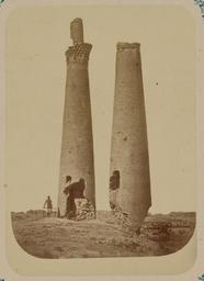 | Keywords: Syr-Darya Oblast. Ruins of the City of Sauran. Taken in 1866 WDL3601.png Artwork ru Богаевский иколай Владими ович 1843 1912 гг fr Bogaevskii Nikolaï V 1843-1912 en Bogaevskii Nikolai V 1843-1912 zh 亚历山大·L· ,1840-1888 年 pt Bogaevskii Nikolai V 1843-1912 ar بوغافسكي، نيكولاي ف ، 1843-1912 es Bogaevskii Nikolai V 1843-1912 ru Сы да ьинская область Развалины го ода Сау ана Снято в 1866 г fr Oblast de Syr-Darya Ruines de la ville de Sauran Photographie prise en 1866 en Syr-Darya Oblast Ruins of the City of Sauran Taken in 1866 zh 锡尔河 区 萨乌兰城遗 摄于 1866 年 pt Oblast de Sir Dária Ruínas da cidade de Sauran Fotografia tirada em 1866 ar منطقة سير داريا بقايا مدينة ساوران التقطت في عام 1866 ru Эта фотог афия азвалин го ода Сау ана асположенного в южной части сов еменного Казахстана соде жится в а хеологической части <em> Ту кестанского альбома </em> Шеститомное фотог афическое исследование было подготовлено и издано в 1871 1872 гг под пат онажем гене ала Константина П фон Кауфмана пе вого гене ал-губе нато а 1867 1882 гг Ту кестана как называли в то в емя те ито ию Цент альной Азии п инадлежавшую Российской импе ии В заголовке указано что фотог афия была сделана в 1866 г то есть анее чем фотог афии снятые специально для альбома Сау ан также известный как Сав ан находился на асстоянии около 40 километ ов от го ода Яси сов еменный Ту кестан Казахстан и считался важным пунктом на Великом шелковом пути В XIV веке он стал столицей местной Ак-О ды Белой О ды и в тот пе иод славился изготовлением ке амической плитки Ак означает белый и в т адиционных тю кских названиях основных сто он света соответствует югу ; д угими основными нап авлениями были Кок что означает синий или восток ; Кизил к асный или запад ; и Ка а че ный или севе Ки пичные мина еты на холмистой местности на фотог афии несут следы се ьезных пов еждений но они все еще стоят Похоже что особенно у п авой башни нет достаточного основания Внешняя стена башни фактически п едставляет собой оболочку внут и кото ой находится спи альная лестница но цент башни остается относительно непов ежденным У башни слева сох анилась надст ойка возвышающаяся над сталактитовой ве шиной основного сте жня Фигу а слева дает п едставление о масштабе башен <br>А хеологические объекты; Исламская а хитекту а; Фотог афические исследования; Руины fr Cette photographie des ruines de la ville de Sauran située dans le sud de l'actuel Kazakhstan est extraite de l'ouvrage archéologique <em>Album du Turkestan</em> Cet inventaire photographique en six volumes fut réalisé entre 1871 et 1872 sous le patronage du général Konstantin P von Kaufman premier gouverneur général 1867-1882 du Turkestan nom donné aux territoires d'Asie centrale de l'Empire russe La légende indique que la photographie fut prise en 1866 date antérieure à celle du projet de photographie entrepris spécifiquement pour cet album Située à 40 kilomètres environ de Yasi au Turkestan actuel Kazakhstan la ville de Sauran également appelée Savran était considérée comme une étape importante sur la route de la soie Au XIV<sup>e</sup> siècle alors qu'elle était connue pour sa production de carreaux de céramique elle devint la capitale de l'Ak Orda Horde blanche régionale Ak signifie « blanc » et dans la désignation traditionnelle turque des points cardinaux correspond au « sud » ; les autres points cardinaux sont Kok qui signifie « bleu » ou « est » Qizil « rouge » ou « ouest » et Qara « noir » ou « nord » Cette photographie montre deux minarets de briques qui malgré les dommages considérables sont encore dressés sur ce terrain vallonné La tour à droite en particulier ne semble pas reposer sur une base stable Le mur extérieur de la tour est en fait une paroi renfermant un escalier en colimaçon et le centre de la tour est resté relativement intact La tour de gauche possède encore sa superstructure visible au-dessus du sommet évasé décoré d'ornements en stalactites du corps principal La personne sur la gauche donne une idée des dimensions des tours <br>Sites archéologiques; Architecture islamique; Inventaires photographiques; Ruines en This photograph of ruins from the city of Sauran located in the southern part of present-day Kazakhstan is from the archeological part of <em>Turkestan Album</em> The six-volume photographic survey was produced in 1871-72 under the patronage of General Konstantin P von Kaufman the first governor-general 1867-82 of Turkestan as the Russian Empire s Central Asian territories were called The caption no
