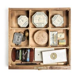 Keywords: Sytillbehör i bordslåda - Hallwylska museet - 108482.tif LSH artwork sv BORD använt som sybord med nyckel Innehållande diverse sybehör m m Av furu Rektangulärt med skiva sarg och fyra ben Fernissat Skiva med utsprång samt på framsidan och kortsidorna med rundad nedtagen kant; ovanpå skivan kring kanterna en målad rand i rödbrunt Sarg med raka kanter i framsidan två lådor Ben svarvade profilerade samt avsmalnande nedåt Lådorna senare inredda i fack över varje fack en glasskiva Höjd 76 3 cm längd 104 cm bredd 56 5 cm Nyckel original med liggande oval platt ögla upptill på pipan en utvängd profilering Längd 6 6 cm bredd 2 5 cm Innehåller diverse sybehör se katalogverket Inköpt av Walther och Wilhelmina von Hallwyl i början av 1900-talet Sybehören inköpta av Wilhelmina von Hallwyl åren 1900 - 1930 hos olika handlare i Stockholm och utlandet original caption Sytillbehör i bordslåda <br/> Nyckelord Förvaring Förvaringar Föremålsbild fir size cm 2 5 nyckel size cm 76 3 size cm 104 size cm 56 5 size cm 6 6 nyckel HWY place of origin original filename hm_dig22154 7425 inventory number HWY XII II A a 01 108482 CC-BY-SA Jens Mohr <gallery caption Different images of same object > File Svarvat bord av lackat furu - Hallwylska museet - 108481 tif File Sytillbehör i bordslåda - Hallwylska museet - 108483 tif </gallery> Boxes Storage Tables Needlework equipment Jens Mohr Media contributed by LSH dim-with multiple size templates Media contributed by LSH 2016-05