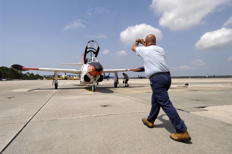 | Keywords: T-2 Buckeye parking.jpg Mike Maciag a civilian Plane Captain with L3 Communications directs the first U S Navy T-2C Buckeye trainer jet to return to Sherman Field on board Naval Air Station Pensacola Fla The aircraft based at Sherman Field were evacuated in preparation of Hurricane Katrina A Category 4 hurricane Katrina came ashore at approximately 7 10 a m EST near the Louisiana bayou town of Buras http //www navy mil/view_image asp id 27519 2005-08-30 Mr Gary Nichols PD-USGov-Military-Navy North American T-2 Buckeye Forrest Sherman Field |