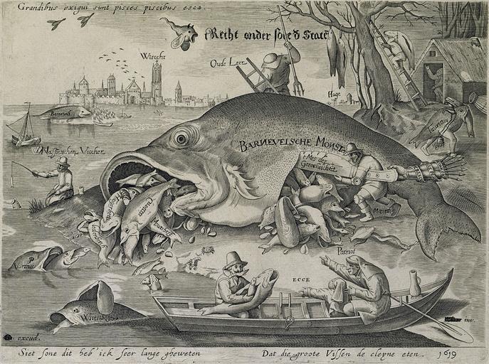 | Keywords: T Recht ondersoec der Staten 001.jpg Northern Netherlands Pieter van der Heyden Pieter Bruegel I LangSwitch Hieronymus Jheronimus Bosch Satirische Bearbeitung der als Kupferstich verbreiteten Zeichnung Die großen Fische fressen die kleinen 1556 1619 engraving paper cm 24 8 31 8 Institution Rijksmuseum Amsterdam Rijksprentenkabinet RP-P-OB-77 302 object history ProvenanceEvent 1881 purchase LangSwitch das the le het Rijksmuseum Amsterdam Amsterdam exhibition history credit line Grandibus exigui sunt pisces piscibus esca title top left la tRecht ondersoec der Staten title top center odt <s>Hh</s> excud signature bottom left la <s>H Bos</s> inv entor bottom right la signature Siet sone dit heb' ick seer lange gheweten - Dat die groote Vissen de cleyne eten 1619 caption / date bottom odt accession number RP-P-OB-77 302 www rijksmuseum nl http //www rijksmuseum nl Home http //www rijksmuseum nl/collectie/RP-P-OB-77 302/de-grote-vissen-eten-de-kleine-vissen-spotprent Info http //www rijksmuseum nl/assetimage2 jsp id RP-P-OB-77 302 Pic Pieter van der Heyden 010 jpg Version without additions Big Fish Eat Little Fish 1557 jpg Original by Pieter van der Heyden Pieter Bruegel the Elder - Big Fish Eat Little Fish 1556 - Google Art Project jpg Original by Pieter Bruegel I PD-old-100 Johan van Oldenbarnevelt 1610s engravings Hendrik Hondius I Pieter van der Heyden Big Fish Eat Little Fish 1556 after Pieter Bruegel the Elder Dutch 17th-century prints in the Rijksmuseum Amsterdam Anonymous Derivative works of famous art Eighty Years' War 1619 People with fish in art Satirical art works |
