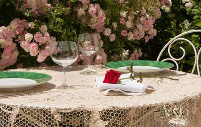 Keywords: table summer roses terrace flowers relaxation sun invitation plates wine glasses tablecloth