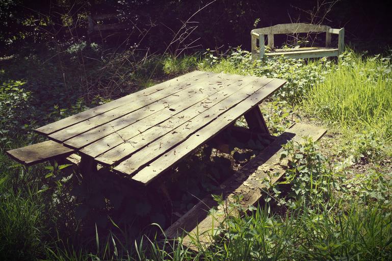 Keywords: table wooden table bank wooden bench bench garden furniture old forget decay leave haunting morsch