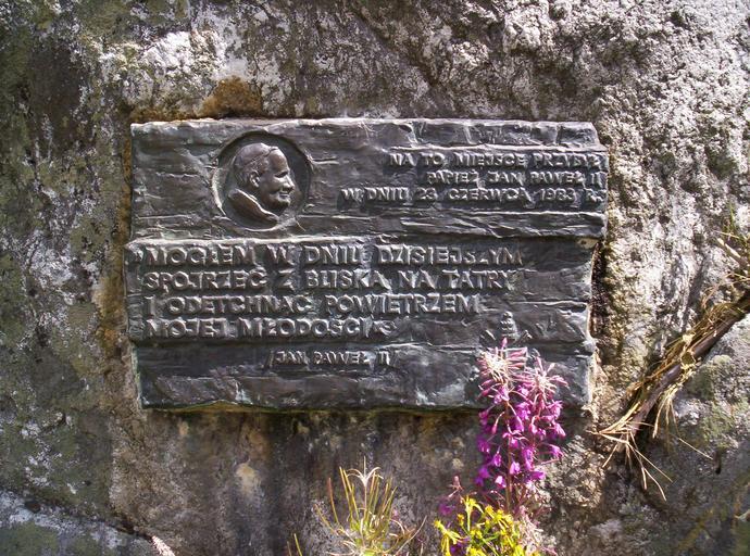 Keywords: Tablica na szlaku papieskim Tatry.jpg pl Tablica pamiątkowa na końcu szlaku papieskiego w Tatrach en Memorial board on end of papal route in Tatra Mountains own Peżot 2009-08-08 Monuments and memorials in the West Tatra Mountains Ioannes Paulus II memorial trails Plaques in Lesser Poland Voivodeship |