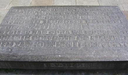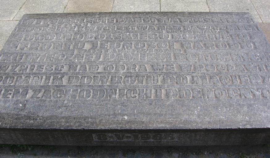 Keywords: Tablica.przy.Moscie.Pokoju.JPG pl Tablica pamiątkowa przy Moście Pokoju we Wrocławiu ul Fryderyka Joliot-Curie <br>tekst inskrypcji <br>W TYSIĄCLECIE PAŃSTWA POLSKIEGO<br>I ROCZNICĘ ZWYCIĘSTWA NAD FASZYZMEM<br>UCHWAŁĄ<br>OGÓLNOPOLSKIEGO KOMITETU<br>FRONTU JEDNOŚCI NARODU<br>POSTANOWIONO<br>KU WIECZNEJ PAMIĘCI POTOMNYCH<br>WZNIEŚĆ NAD ODRĄ WE WROCŁAWIU<br>POMNIK POWROTU DO MACIERZY<br>ZIEM ZACHODNICH I PÓŁNOCNYCH<br> <br>8-V-1966 own Julo 2008-05-31 Julo Plaques in Wrocław |