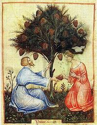 | Keywords: Tacuin pin27.jpg en Pine Cones Pinee Nature Warm in the second degree dry in the first Usefulness They stimulate the bladder the kidneys and the libido Dangers Worms hatch in their bark Neutralization of the Dangers Trim the tree often From the Tacuinum of Paris fr Pommes de pin Pinee Nature Chaud au deuxième degré sec au premier degré Usage Elles stimulent la vessie les reins et la libido Dangers Des vers peuvent éclore dans l ™Ã©corce Neutralisation des dangers Trim souvent l'arbre book scan unknown master century 14 PD-Art Tacuinum sanitatis - BNF NAL1673 Pines in art |