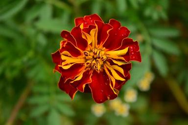 Keywords: tagete marigold blossom bloom flower plant nature yellow red red and yellow close wet drip drop of water bright beautiful greeting card