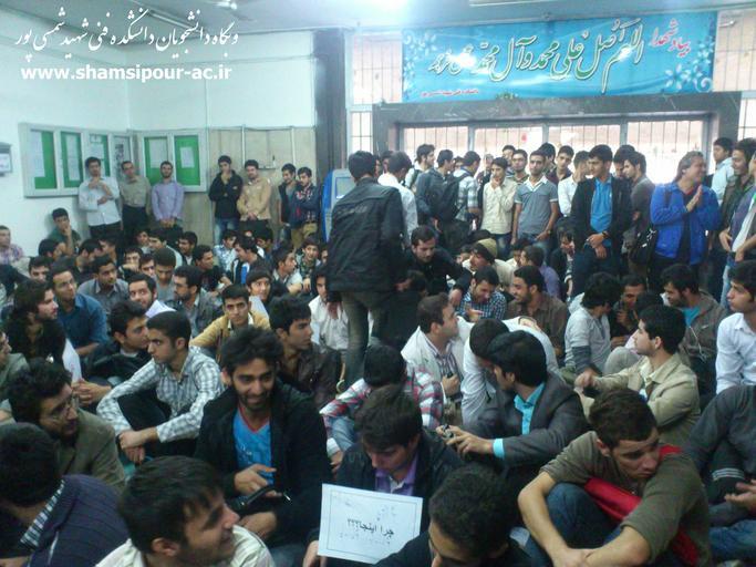 | Keywords: Tahasoon 91.08.06 WWW.SHAMSIPOUR-AC.IR.jpg fa تحصن روز شنبه مورخ 1391/08/06 دانشجویان دانشکده فنی شمسی پور در اعتراض به انتقال بخش اداری دانشگاه فنی و حرفه ای به دانشکده شهید شمسی پور واقع در میدان ونک و جابجایی دانشکده به ساختمانی مجهول در میدان امام حسین http //shamsipour-ac ir/ shamsipour-ac ir Saturday October 27 2012 Cc-zero Technical and Vocational University Demonstrations and protests by students | ||||