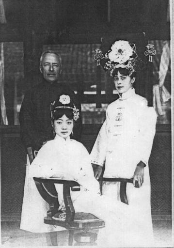 Keywords: TaitaiWanRongJohnston.jpg Picture of Reginald Johnston Empress Wan Rong and Isabel Ingram in the Forbidden City Beijing China The context of the photo is given by Isabel Ingram's diary entry for June 11 1924 Went in at 10 30 as usual Surprised the Emperor playing the piano in the Chien Hsiao Kung The Empress was combing her hair I watched the process The Emperor came in and started to tickle her and was cutting up the whole day It was suggested that my hair be combed Manchu style again The Emperor agreed at once and sent for a photographer also said he would dress Johnston up too The Emperor went over for him and brought him back to the Empress's palace before we were ready They all watched the process It took quite awhile -- making new parts etc Liu combed it again I wore a light green gown with a lavender chin shih which the Empress gave me afterwards own archive 1924-06-11 Kenmayer 1920s headwear 1920s photographs of China 1924 in Beijing 20th-century black and white photographs of China Group photographs June 1924 in China Empress_Wan-Rong People of China in 1924 People of the United States in 1924 Three people |
