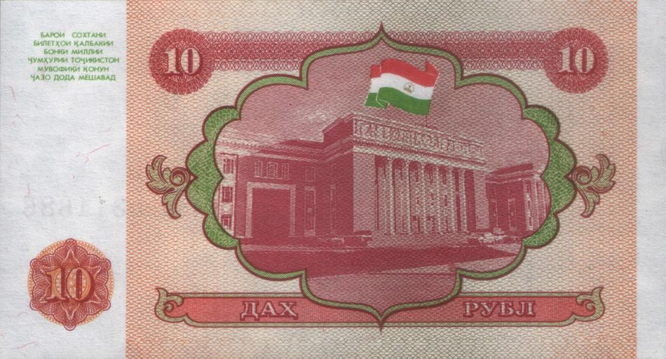 Keywords: Tajikistan-1994-Bill-10-Reverse.jpg 10 таджикских ублей 1994 Цвет как у советских 10 ублей 1961 г 1991 г 10 roubles of Tajikistan 1994 own scan 1994 ациональный банк Таджикистана National Bank of Tajikistan Бонки миллии Тоҷикистон PD-TJ-exempt banknotes Banknotes of Tajikistan 1994 Banknotes with a face value of 10 Red banknotes |