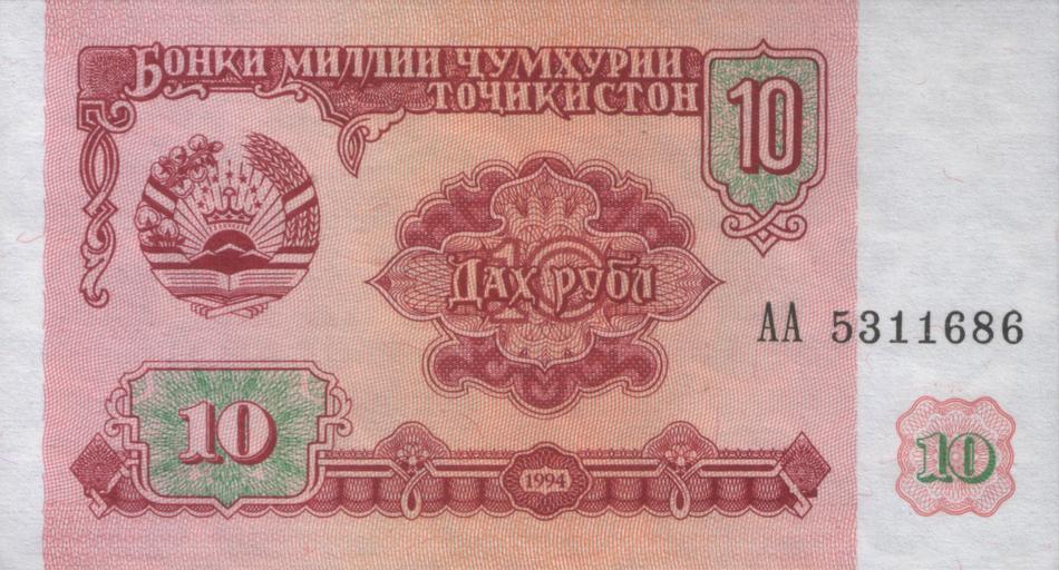 Keywords: Tajikistan-1994-Bill-10-Obverse.jpg 10 таджикских ублей 1994 Рисунок похож на аве с 1 убля СССР об азца 1961 года Цвет как у советских 10 ублей 1961 1991 10 roubles of Tajikistan 1994 own scan 1994 ациональный банк Таджикистана National Bank of Tajikistan Бонки миллии Тоҷикистон PD-TJ-exempt banknotes Banknotes of Tajikistan 1994 Banknotes with a face value of 10 Red banknotes |