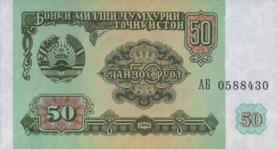 Keywords: TajikistanP5-50Rubl-1994 f-donated.jpg 50 таджикских ублей 1994 Цвет - как у пяти ублей СССР 1991 г 50 roubles of Tajikistan 1994 own scan 1994 ациональный банк Таджикистана National Bank of Tajikistan Бонки миллии Тоҷикистон PD-TJ-exempt banknotes Banknotes of Tajikistan 1994 Banknotes with a face value of 50 Green banknotes |