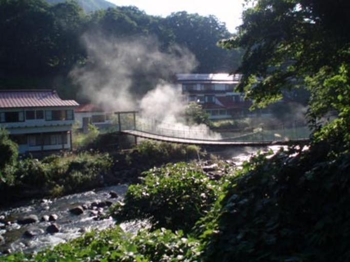 Keywords: Takanoyu Onsen Bridge and Hot Spring 005.JPG en Photo of Takanoyu Onsen and steam rising from the hot spring Akita Prefecture Japan own RickardA 2007-09-21 Takanoyu Onsen Suspension footbridges in Japan Bridges in Akita prefecture