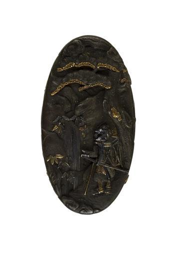 Keywords: Takase Eiju - Kashira with Yamabushi Monk and a Waterfall - Walters 511129.jpg A yamabushi monk is depicted looking at a waterfall He wears the distinctive yamabushi clothing including a small hat and a sash with pom-poms around his neck He carries a wicker pack and a walking stick Yamabushi lived in the mountain where they practiced a religious tradition that mixed elements of Shintoism and Buddhism This is part of a set with Walters 51 1128 ca 1775 1800 Edo silver gold cm 3 3 accession number 51 1129 15157 William T / Henry Walters Collection Baltimore date and mode of acquisition unknown Walters Art Museum Henry Walters Acquired by William T or Henry Walters none place of origin Edo present-day Tokyo Japan Walters Art Museum license Tosogu Japanese sword fittings in the Walters Art Museum Takase Eiju Media contributed by the Walters Art Museum needs category review |