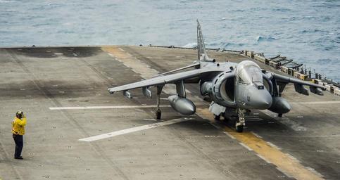 | Keywords: Talisman Saber 2013 130729-N-KE519-072.jpg en A sailor salutes the pilot of an AV-8B Harrier attached to the Blacksheep of Marine Attack Squadron VMA 214 on the flight deck of forward-deployed amphibious assault ship USS Bonhomme Richard LHD 6 Bonhomme Richard is the flagship of the Bonhomme Richard Amphibious Ready Group and with the embarked 31st Marine Expeditionary Unit is currently participating in Talisman Saber 2013 a biennial exercise that enhances multilateral collaboration between U S and Australian forces for future combined operations humanitarian assistance and natural disaster response U S Navy photo by Mass Communication Specialist Seaman Apprentice Edward Guttierrez III/Released 2013-07-29 Petty Officer 3rd Class Edward Guttierrez III https //www dvidshub net/image/983745 130729-N-KE519-072 2013-07-29 17 27 CORAL SEA PD-USGov-Military-Navy Harrier II aircraft family 31st Marine Expeditionary Unit USS Bonhomme Richard LHD-6 Images from DoD uploaded by Fæ |