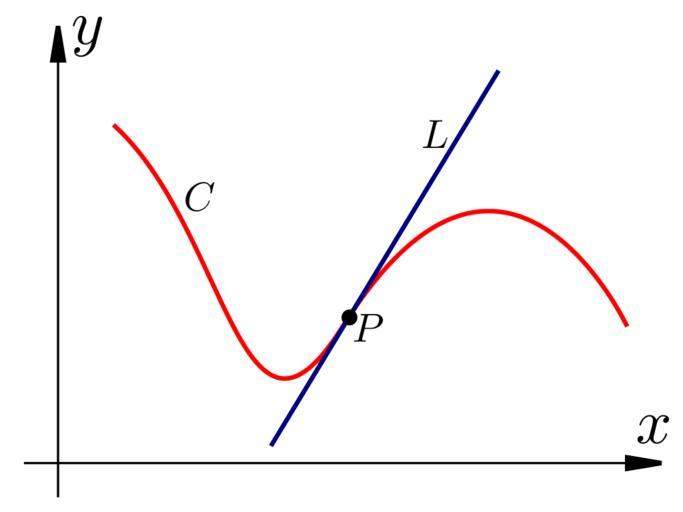 Keywords: Tangency Example 2.svg A diagram showing a curve C red a line L blue and the point of intersection point P black The line intersects the curve but 'is a tangent to it Self-made Inkscape 2007-10-23 Inductiveload differential calculus Tangency |