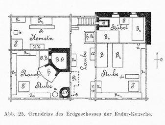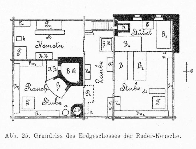 Keywords: Tangern Dorfplatz 03 1902 b.jpg Plan des Erdgeschosses der Rader Keusche im Jahre 1902 in Tangern am Millstätter Berg Hochplateau über dem Millstättersee / Gemeinde Seeboden in Kärnten / Österreich / Europäische Union Diese Abbildung stammt aus dem Beitrag von J R Bünker in Ödenburg Das Bauernhaus am Millstätter See in Kärnten Wien 1902 Sonderdruck aus Band XXXII Der dritten Folge Band II der žMittheilungen der Anthropologischen Gesellschaft in Wien Seite 48 Dieses Haus im Jahre 2009 Grundriss des Holzhauses im Jahre 1900 gezeichnet von Johann Reinhard Bünker žLaube - Vorhaus; žH B - Hackblock; žA - Ã…lma Kasten mit Fächern; žKa - Kleiderkasten Kasten; žW B - Wasserbank zum Abstellen von Gefäßen mit Wasser; žRauch-Stube - Küche mit offenem Feuer mit sechs kleinen Fenster; žT - Tisch; žBa / Ba2 / Ba3 - Bänke entlang der Fenster; žO -B - Ofenbank; žS -K - Saufutterkessel für Schweinefutterbereitung; ža - KÃ¥sp'lfÃ¥ss Spülicht für Speisereste; žKemeten - Kamma'le kleine Kammer Arbeits- Zimmer mit zwei Fenster; žK K - Speis'kast'l Küchenkasten; žTr / Tr2 - Truhen; žSt - Stuhl; žb - ein Loch im hölzernen Fußboden durch das im Herbst Rüben und Kartoffeln in den darunterliegenden Keller geworfen wurden; žStube - Kachelstube früher mit Ofen großes Zimmer; žB / B2 / B3 / B4 - Betten; žU - Uhr; žStübel - hintare Stib'l; žO - gemauerter Ofen; žStube und žStübel waren ursprünglich ein Raum Schlafordnung um 1900 Der 17jährige Sohn und sein Vater schliefen im Stübel in B3 Ebenfalls dort in B4 schliefen Mutter und die 21jährige Tochter In B in der Stube schlief die Großmutter in B2 der Großvater mit dem 6jährigen Enkel Floor plan of the Rader Keusche a old farm house in 1902 of a former wheelwrighter in Tangern near lake Millstatt Millstätter See community of Seeboden / Spittal an der Drau / Carinthia / Austria / EU A very good example of a preserved almost unchanged Carinthia Small Farm Here is the wooden house in its present state in 2009 Layout of the house in 1900 drawn by Johann Reinhard Bünker Laube - lobby; žH B - chopping block; žA - Ã…lma small wooden box with compartments; žW B - Water bank stand with the parking of water vessels; žRauch-Stube - kitchen with open fire with six small windows; žT - Desk; žBa / Ba2 / Ba3 - Benches along the window; žO -B - Bench by the stove; žS -K - Boiler for the preparation of food for the pigs; ža - swill for leftovers; žKemeten - small chamber working room with two windows; žK K - food box; žTr / Tr2 - chests; žSt - chair; žb - a hole in the wooden floor which are thrown by the turnips and potatoes into the underlying basement; žStube - Furnace room formerly with oven large room; žB / B2 / B3 / B4 - beds; žU - clock; žStübel - rear small room; žO - brick oven; žStube and žStübel was originally a room that is now separated by a wooden wall Sleeping arrangements in 1900 The 17 year old son and his father slept in the bed in Stübel B3 Also there in B4 sleeping mother and 21 year old daughter O In the room bed B the grandmother was asleep with his grandfather in B2 of the 6 year old grandson own summer 1902 scan 21 06 2012 scan and upload by Joadl User Joadl/Ref2 Pd-old Johann Reinhard Bünker Bauernhaus am Millstätter See 1902 Rader Tangern Seeboden Floor plans of Carinthia Tangern Seeboden Floor plans of houses Photographs taken on 2012-06-21 Files by User Joadl Scanned with Epson Perfection V500 Office Scanner