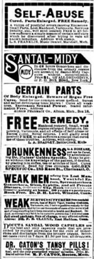 | Keywords: TansyPills.jpg A Victorian or turn-of-the-20th-century newspaper clipping Source Encylopedia Titanica http //www encyclopedia-titanica org/cgi-bin/discus/show cgi tpc 5670 post 140809 Full copy An approximate reading of the text SELF-ABUSE Cured Parts enlarged FREE remedy A victim of youthful errors causing emissions small parts lost manhood varicocele nervous debility etc will send sealed FREE to all fellow sufferers a simple means of certain self-cure which he discovered after trying in vain all known remedies Address with stamp L S Franklin Music Dealer Marshall Mich SANITAL-MIDY Midy In 48 hours gonorrhea and discharges from the urinary organs are arrested by Sanital-Midy Capsules without illegible Price 1 Of all druggists or P O Box 2081 New York CERTAIN PARTS of body enlarged Beware of bogus free cures Cures all weakness Send for the illegible method Surest and safest developing illegible Increases sexual power Sealed information free Address Albion Pharmacy Co Albion Mich Box 18 FREE REMEDY Manhood restored Small weak organs enlarged Emissions impotency varicocele and all effects of Self-Abuse or Excess cured Never returns I will gladly send sealed FREE to all sufferers a recipe that cured me of illegible Address with stamp L A Bradley Battle Creek Mich DRUNKENESS is a disease and can be cured by administering Dr illegible Golden Specific It can be given without the knowledge of the patient if desired by placing it in coffee tea or articles of food Cures guaranteed Send for free circulars Golden Specific Co 185 Race St Cincinnati O WEAK MEN suffering from lost manhood youthful errors spermatorrhea gonorrhea illegible syphllis and all private diseases Illegible Illegible quietly at home 30 years experience Book free Dr D H Lowe Winsted Conn WEAK nerves sufferers from youthful errors majority of ad illegible I will send one full sized package free of charge to any illegible sufferers Address Dr F B Clarke East Haddon Conn DOCUTA SANDAL WOOD CAPSULES are the best and only capsules that are prescribed by regular physicians for the cure of gonorrhea and discharges from the urinary organs Several cases cured in 7 days 1 50 per box All druggists Dr Caton's Tansy Pills The most reliable remedy for ladies Always safe effectual and the only guaranteed women's salvation Price 1 Second advice free R F Caton Boston Mass PD-old original upload log 1 date/time username edit summary ---- 04 49 8 December 2005 en User Kyd <nowiki> PD-old A Victorian or turn-of-the-20th-century newspaper clipping The relevant text reads Dr Caton's Tansy Pills The most reliable remedy for ladies Always safe effectual and the only guaranteed womens' salvation Price illegible R F Ca </nowiki> Gonorrhea posters and product advertisements History of abortion Advertisements in the United States Medicine advertising |