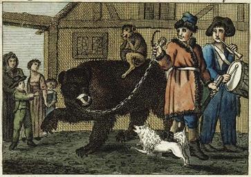 Keywords: Tanzbär 1810.jpg de Tafel V aus Johann Ferdinand Schlez BilderFibel zur Beförderung der LautMethode Ein Versuch die Absicht des ABC-Bilderwesens durch eine neue Anwendung desselben besser zu erreichen nebst einem Lesebuch Giessen u a 1810 Entsprechender Lehrbuchtext Erklärung der Vten Tafel Nro 9 Ein Bär von seinem Führer an einem Nasenringe durch eine Kette gehalten brummt seitwärts mit finsterm Angesichte gegen ein kleines Hündchen M - m - m brummt er - Was doch der alte Brummer gegen den kleinen Spitz einzuwenden hat - Je nun es verdrießt ihn daß der kleine Belfer mit seinem r - r - r - r ihn anknurrt Verdenkt ihr das dem gefesselten Helden - Wie würd' es dem muthwilligen Necker gehn wenn der Führer den Bären los ließe Welcher von beiden hier unten stehenden Buchstaben ist der Brumm und welcher der Marrlaut Könnt ihr beide auch im Buche finden 1810 http //www bbf dipf de/cgi-opac/bil pl t_direct x f_IDN b0087754berl author Ursari Gießen 1810 in art Street performers Roma people in Germany Roma people in art Dancing bears People with bears in art People with monkeys in art Animals sitting on other animals Images from Pictura Paedagogica PD-old-100 |