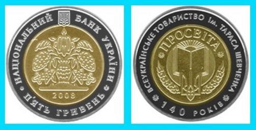 Keywords: Taras Shevchenko Coins-140 years.jpg en Coins with Taras Shevchenko name <br/>Coin left On the obverse within the central circle there is depicted the tree of life as an ornamental pattern with the year of issue there under; above there is the Small National Emblem of Ukraine; on the ring there is the circumferential inscription АЦІО АЛЬ ИЙ БА К УКРАЇ И П ЯТЬ ГРИВЕ Ь National Bank of Ukraine Five hryvnias Coin right On the reverse there are the emblem of the All-Ukrainian Prosvita Enlightenment Society and the circumferential inscription ВСЕУКРАЇ СЬКЕ ТОВАРИСТВО І ТАРАСА ШЕВЧЕ КА 140 РОКІВ All-Ukrainian Society named after Taras Shevchenko 140 years National Bank Banknotes and Coins Commemorative and jubilee coins http //www bank gov ua/Engl/Bank_coin/YUV_MON/THEME htm Others Labberté K J 2009-04-06 Coins of Ukraine 2008 Taras Shevchenko on coins Images from bank gov ua |