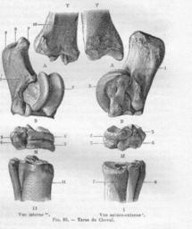 Keywords: TarseChevalChauveauCM1890.jpg en The tarsus of the horse Equus caballus fr Le tarse du cheval Equus caballus <br /> A os de la rangée supérieure<br /> -1 calcanéum -2 astragale<br /> B os de la rangée inférieure <br /> -3 grand cunéiforme -4 scaphoïde -5 cuboïde -6 petit cunéiforme <br /> M métatarse<br /> T tibia<br /> ” Chauveau Auguste Arloing Saturnin Traité d'anatomie comparée des animaux domestiques <br /> 1 064 p page 153 1890 Paris Lib J B Baillière et Fils domaine public décès des auteurs 1917 et 1911 Meyer C 2011-03-15 PD-old Horse leg bones |