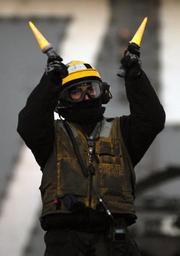 Keywords: Taximan DVIDS75798.jpg en Aviation boatswain's mate Handler Petty Officer 3rd Class Gerald J Garces assigned to Air Department's V-1 division aboard the Nimitz-class nuclear-powered aircraft carrier USS Harry S Truman CVN 75 taxies an aircraft during flight operations Truman and embarked Carrier Air Wing CVW 3 are underway on a scheduled deployment in support of Operations Iraqi Freedom Enduring Freedom and maritime security operations in the 5th Fleet area of responsibility U S Navy Photo/mass communication specialist Petty Officer 3rd Class Ricardo J Reyes 2008-01-14 Ricardo Reyes https //www dvidshub net/image/75798 080114-N-+++++-121 2008-02-04 16 33 USS HARRY S TRUMAN AT SEA PD-USGov-Military-Navy USS Harry S Truman CVN-75 Images from DoD uploaded by Fæ |
