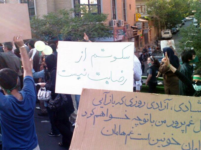 | Keywords: Tazahorat sabz (15).JPG Protest demonstration against election results 7th Tir thru Karimkhan to Vali Asr Sq and beyond Tehran Sign reads Dont think my silence is because I approve myself on behalf of photographer Saba The photographer nicknamed Saba wishes to remain anonymous I have permission from photoghrapher to upload to WikiCommons under PD license Contact me for verification Protests relating to the Iranian presidential election 2009 from 7th Tir to Vali Asr Tehran | ||||