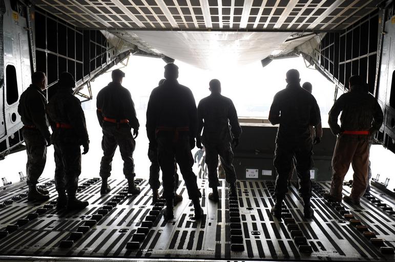 Keywords: teamwork crew airplane air force cargo unloading silhouettes group plane military task ground galaxy c5 usa