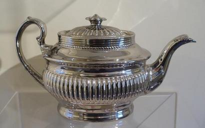 Keywords: Teapot, England, c. 1820, earthenware with silver-luster glaze - Concord Museum - Concord, MA - DSC05765.JPG en Exhibit in the Concord Museum Concord Massachusetts USA 2014-12-30 14 00 50 own Daderot other versions PD-old-100 cc-zero Ceramics in the Concord Museum English pottery |