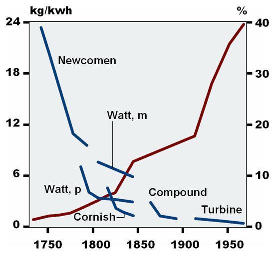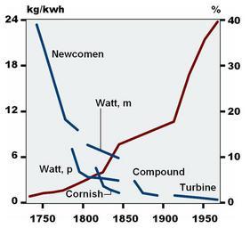 | Keywords: TechEfficiency.PNG The effect of technological progress on energy efficiency and thus the consumption of energy Blue curves show the consumption of fuel coal kg/kwh after different innovations red curve shows maximum thermal efficiency Watt p stands for Watt pump Watt m for Watt mill X axis shows years Source Shell 2001 Energy Neeeds Choises and Possibilities - Scenarios to 2050 2006-03-26 own assumed Tungsten Energy efficiency | ||||