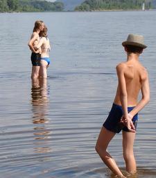 Keywords: teens youth in the water river summer sun the glare wave ripple