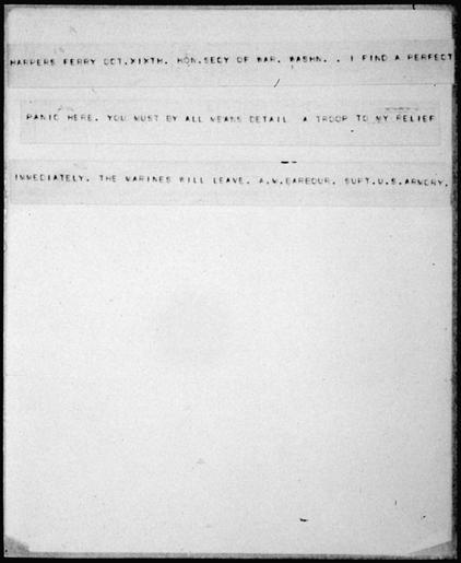 Keywords: Telegram from A.M. Barbour, Superintendent of the Arsenal at Harpers Ferry to the Secretary of War - NARA - 300374.tif Scope and content On October 16 1859 John Brown and his army of some 20 men seized the federal arsenal at Harper's Ferry Virginia now West Virginia By the morning of October 18 Marines under the command of Bvt Col Robert E Lee stormed the building and captured Brown and the survivors of his party Even after Brown was captured false rumors persisted about abolitionists and slaves hiding in the mountains preparing for a new attack on the town It was in this atmosphere of panic as the Marines prepared to withdraw that the Superintendent sent this plea for help to the Secretary of War General notes Letters Received Main Series File W-386 Exhibit History American Originals December 1996 - December 1997 National Archives Rotunda Washington DC Exhibit No 624 0054 300374 Local identifier War Department The Adjutant General's Office 03/04/1907 - 09/18/1947 Archives I Reference Section Textual Archives Services Division NWCT1R National Archives Building 7th and Pennsylvania Avenue NW Washington DC 20408 1859-10-19 Record group Record Group 94 Records of the Adjutant General's Office 1762 - 1984 Record group ARC 423 Letters Received compiled 1805 - 1889 Series ARC 300368 File unit File unit ARC Variant control numbers NAIL Control Number NWCTB-94-CORRPI17E12-W386 1859 2<br /> NAIL Control Number NWDT1-94-CORR-PI17E12-W386 1859 2<br /> Other Identifier 03559<br /> This is the NARA internal exhibit tracking number yes Other versions <gallery> File Telegram_from_A M _Barbour _Superintendent_of_the_Arsenal_at_Harpers_Ferry_to_the_Secretary_of_War_-_NARA_-_300374 jpg jpg </gallery> NARA-cooperation PD-USGov Telegrams from the United States 1859 letters John Brown's raid on Harpers Ferry NARA TIF images with categorized JPGs |
