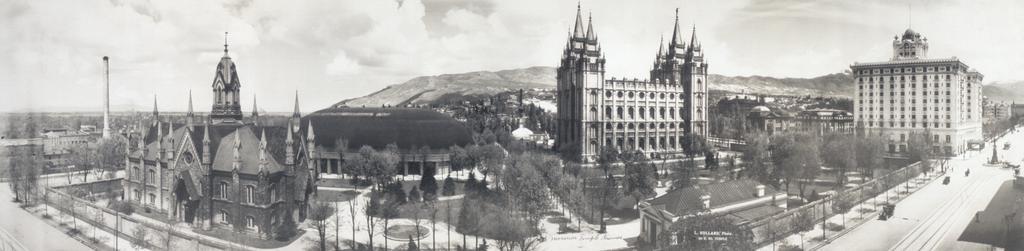 Keywords: Temple Square 1912 panorama.jpg Panoramic photo of w Temple Square The photo is taken from South Temple Street between Main and West Temple From left to right are the Salt Lake Assembly Hall the Salt Lake Tabernacle the dark roofed domed structure behind the Hall the Salt Lake Temple and Hotel Utah is on the far right Hotel Utah is now the Joseph Smith Memorial Building LOC-image pan 6a10553 1912 L Hollard File Mormon Temple grounds LCCN2007662832 tif PD-old Black and white panoramic photographs of cities Joseph Smith Memorial Building Temple Square 1912 in Utah Utah skylines |