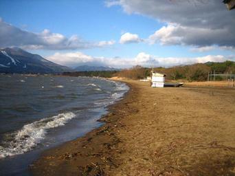 Keywords: Tenjinhama in winter.JPG A picture of Tenjinhama at Lake Inawashiro Picture was taken in Inawashiro Fukushima Prefecture Japan with a Canon Power Shot SD450 Digital Elph camera and modified using a Paint Shop program on a laptop computer Own 2007-12-09 BrianAdler Tenjin Beach Lake Inawashiro |