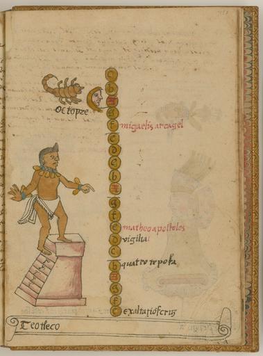 Keywords: Teotleco, Return of the Gods, the 12th Month of the Aztec Solar Calendar WDL6713.png Artwork ru Това Хуан де около 1546 г около 1626 г fr Tovar Jean de 1546-1626 env en Tovar Juan de circa 1546-circa 1626 zh 胡安·德·托瓦尔,约 1546 年 - 约 1626 年 pt Tovar Juan de por volta de 1546-por volta de 1626 ar خوان دو توفار، حوالي 1546-حوالي 1626 es Tovar Juan de circa 1546-circa 1626 ru Теотлеко возв ащение богов 12-й месяц солнечного календа я ацтеков fr Teotleco retour des dieux douzième mois du calendrier solaire aztèque en Teotleco Return of the Gods the 12th Month of the Aztec Solar Calendar zh 阿兹特克太阳历的第 12 个 众神至 pt Teotleco retorno dos deuses o 12º mês do calendário solar asteca ar تيوتليكو، عودة الآلهة، الشهر الثاني عشر من التقويم الشمسي الأزتكي ru Кодекс Това а авто ом кото ого считается мексиканский иезуит XVI века Хуан де Това соде жит под обную инфо мацию об об ядах и це емониях ацтеков известных также как мешика Кодекс п оиллюст и ован 51 аква ельным исунком на полную ст аницу Рисунки в кото ых наблюдается значительное влияние пиктог афических укописей доколониальных в емен обладают исключительными художественными достоинствами Рукопись состоит из т ех азделов В пе вом азделе описана исто ия путешествий ацтеков до п ибытия испанцев Вто ой аздел п едставляет собой иллюст и ованную исто ию ацтеков В т етьем азделе находится календа ь Това а в кото ом п ослеживается календа ный цикл ацтеков с месяцами неделями днями воск есными буквами и елигиозными п аздниками х истианского 365-дневного года а этой иллюст ации из т етьего аздела изоб ажен поднимающийся на пи амиду мальчик на шее у него голубое оже елье с золотыми подвесками на голове искусно сделанная п ическа а ступеньках видны его следы В тексте под обно описывается то жество в честь Уицилопочтли и кульминацией его является появление детских следов ведущих вве х к п инесенной в же тву пище ад головой мальчика на исован ско пион Этот месяц оп еделяемый как октяб ь по аст ологическому символу ско пиона называется теотлеко или пачтонтли возв ащение богов есяц был посвящен Уицилопочтли богу солнца и войны или Тескатлипоке Дымящееся зе кало богу ночного неба и памяти П ическа мальчика напоминает ко оны знати <br>Аст ология; Календа ь ацтеков; Боги ацтеков; Ацтеки; Календа и; Кодекс; Индейцы ексики; Ко енные на одности; езоаме ика; Кодекс Това а fr Le codex Tovar attribué à Jean de Tovar jésuite mexicain du XVI<sup>e</sup> siècle contient des informations détaillées sur les rites et les cérémonies des Aztèques également connus sous le nom de Mexicas Il est illustré de 51 aquarelles de la taille d'une page Fortement influencées par les manuscrits pictographiques de la période précontact ces peintures sont d'une qualité artistique exceptionnelle Le manuscrit est divisé en trois sections La première section contient une histoire des voyages des Aztèques avant l'arrivée des Espagnols La deuxième section est une histoire illustrée des Aztèques Dans la troisième section le calendrier de Tovar transcrit un calendrier aztèque continu avec les mois les semaines les jours les lettres dominicales et les fêtes liturgiques d'une année chrétienne de 365 jours Cette illustration extraite de la troisième section représente un garçon gravissant une pyramide et portant un collier bleu avec des pendentifs dorés et une coiffe sophistiquée Ses empreintes de pas sont visibles sur les marches Le texte décrit en détail la fête en l'honneur d'Huitzilopochtli qui culmine avec l'apparition des empreintes de pas d'un enfant menant à une offrande de nourriture Au-dessus de la tête du garçon un scorpion est dessiné Ce mois appelé Teotleco ou Pachtontli retour des dieux est assimilé à octobre avec le signe astrologique du Scorpion Ce mois était dédié à Huitzilopochtli dieu du Soleil et de la guerre ou à Tezcatlipoca Miroir fumant dieu du ciel nocturne et de la mémoire La coiffure du garçon rappelle les couronnes de la noblesse <br>Astrologie; Calendrier aztèque; Dieux aztèques; Aztèques; Calendriers; Codex; Indiens du Mexique; Peuples autochtones; Méso-Amérique; Codex Tovar en The Tovar Codex attributed to the 16th-century Mexican Jesuit Juan de Tovar contains detailed information about the rites and ceremonies of the Aztecs also known as Mexica The codex is illustrated with 51 full-page paintings in watercolor Strongly influenced by pre-contact pictographic manuscripts the paintings are of exceptional artistic quality The manuscript is divided in