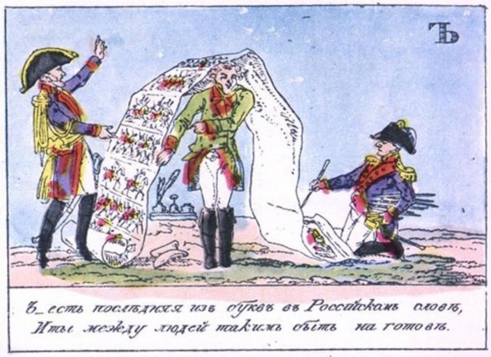 | Keywords: Terebenevskaya azbuka - Ъ.jpg ru знаменитое издание «Пода ок детям в память о событиях 1812 года» более известное как «Те ебеневская азбука» Её создатель скульпто И И Те ебенев 1780-1815 завоевал поистине всена одную славу своими г афическими листами на темы Отечественной войны 1812 года Те ебеневу п инадлежит более полусотни сати ических исунков снискавших на яду с ка икату ами А Г Венецианова и И А Иванова небывалую популя ность в самых ши оких к угах усского общества s 1810 http //www museum ru/museum/1812/Library/Azbuka/ И И Те ебенев 1780-1815 other versions PD-old-70-1923 Terebenevskaya azbuka Russian hard sign Cyrillic hard sign as an initial Files uploaded by Shakko from various sources Uploaded with UploadWizard |