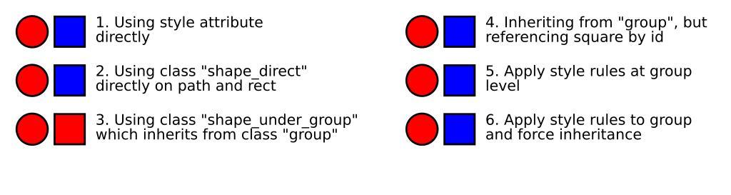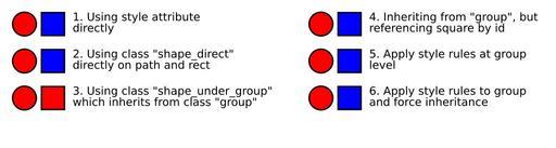 | Keywords: Test only.svg CSS child selectors are not supported http //www w3 org/TR/2009/CR-CSS2-20090908/selector html bugzilla 41423 Test image applying style sheets checks libsvg rendering All items should look the same View source for what works and what doesn't Own 2007-08 H2g2bob Tests wikitable Engine 1 2 3 4 5 6 Notes - MediaWiki libsvg Yes Yes No No Yes No Cannot render descendant selectors and using property inherit with other style classes fails - Inkscape 0 45 0 46 Yes Yes No Yes Yes Yes In 3 misses rule for square class - KSVG 0 1 Yes No No No No No Can't do style - Firefox Iceweasel 2 0 0 6 Yes Yes Yes Yes Yes Yes - Opera 9 64 Yes Yes Yes Yes Yes Yes 1 - Apply style directly This method always works and is the type automatically generated eg by Inkscape Path is the circle rect is the square <g> <path style stroke-width 2; fill red; > <rect style stroke-width 2; fill blue; > 2 - Applying style to path and rect using a stylesheet Uses the svg style element to define style rules as in a CSS stylesheet Applies a shape_direct class to both shapes and applied square class to the square to make it blue square class uses important to override shape_direct's red color <style> shape_direct stroke-width 2; fill red; square fill blue important; <g> <path class shape_direct > <rect class shape_direct square > 3 - Style rules on inherited style classes Same as 2 but replaces shape_direct class with the two classes shape_under_group and group as http //www w3 org/TR/CSS21/selector html descendant-selectors descendant-selectors <style> group shape_under_group stroke-width 2; fill red; square fill blue important; <g class group > <path class shape_under_group > <rect class shape_under_group square > 4 - Style rules on inherited style classes Same as 3 but replaces square class with a rule looking for an item with the id square_id under any object of group class <style> group shape_under_group stroke-width 2; fill red; group square_id fill blue; <g class group > <path class shape_under_group > <rect class shape_under_group id square_id > 5 - Style rules applied to higher-level elements Tests http //www w3 org/TR/CSS21/cascade html inheritance inheritance of style rules In firefox and inkscape applying a style to an element then applies that style to all child elements; others may apply default style sheets <style> shape_direct stroke-width 2; fill red; square fill blue important; <g class group > <path> <rect class square > 6 - Force inherit Same as 5 but explicitly requests inheritance <style> shape_direct stroke-width 2; fill red; square fill blue important; force_inherit fill inherit; stroke inherit; stroke-width inherit; opacity inherit; fill-opacity inherit; <g class group > <path class force_inherit > <rect class force_inherit square > Pictures showing a librsvg bug Cascading Style Sheets Examples representing SVG Image detail for discussion |