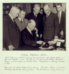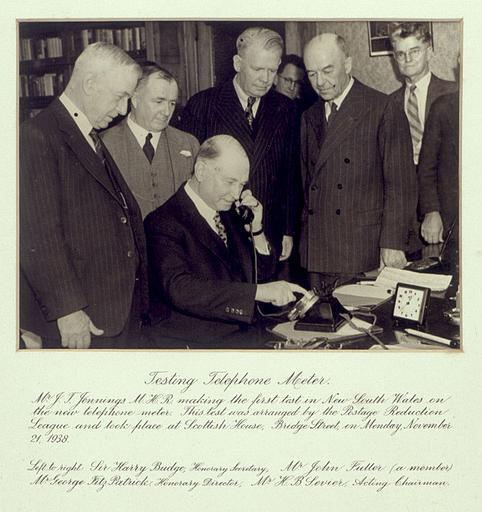 Keywords: state library of new south wales statelibraryofnewsouthwales sir harry budge sirharrybudge telephone 1938 telephone meter telephonemeter jennings scottish house scottishhouse sevier new south wales newsouthwales test first historic monochrome Format: 1 photoprint - 15.1 x 20.3 inside mount; 30.4 x 33.6 cm mount Notes: Mr J.T. Jennings, M.H.R. making the first test in New South Wales on the new telephone meter. This test was arranged by the Postage Reduction League and took place at Scottish House, Bridge Street, on Monday, November 21, 1938. / Left to right: Sir Harry Budge, Honorary Secretary, Mr. John Fuller (a member) Mr George FitzPatrick, Honorary Director, Mr H.B. Sevier, Acting Charirman. From the collections of the Mitchell Library, State Library of New South Wales www.sl.nsw.gov.au Information about photographic collections of the State Library of New South Wales acms.sl.nsw.gov.au/search/SimpleSearch.aspx Persistenturl: acms.sl.nsw.gov.au/item/itemDetailPaged.aspx?itemID=153611 Format: 1 photoprint - 15.1 x 20.3 inside mount; 30.4 x 33.6 cm mount Notes: Mr J.T. Jennings, M.H.R. making the first test in New South Wales on the new telephone meter. This test was arranged by the Postage Reduction League and took place at Scottish House, Bridge Street, on Monday, November 21, 1938. / Left to right: Sir Harry Budge, Honorary Secretary, Mr. John Fuller (a member) Mr George FitzPatrick, Honorary Director, Mr H.B. Sevier, Acting Charirman. From the collections of the Mitchell Library, State Library of New South Wales www.sl.nsw.gov.au Information about photographic collections of the State Library of New South Wales acms.sl.nsw.gov.au/search/SimpleSearch.aspx Persistenturl: acms.sl.nsw.gov.au/item/itemDetailPaged.aspx?itemID=153611 |