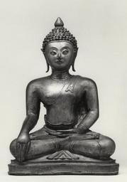 | Keywords: Thai - Seated Buddha in "Maravijaya" - Walters 542833.jpg This is a Sihing-type image with stylistic traits associated with the city of Nakhon Si Thammarat It has not only the robe edge that runs from mantle to waist and the presence of pleats between the legs but also the broad face and particularly squat body characteristic of the local tradition The sculpture is a marriage although both head and body are old they were joined together at an unknown date perhaps relatively recently It is possible that both parts were made in Nakhon Si Thammarat at about the same time century 16 17 Ayutthaya leaded bronze leaded tin brass at knees cm 35 5 22 4 accession number 54 2833 27735 Alexander B Griswold Monkton presented to the Breezewood Foundation 1985 inv no 923 Walters Art Museum Henry Walters Bequest of A B Griswold 1992 none Unearthly Elegance Buddhist Art from the Griswold Collection The Walters Art Gallery Baltimore 1995 place of origin Nakhon Si Thammarat Thailand Walters Art Museum license Thai sculptures in the Walters Art Museum Art of Ancient Thailand Media contributed by the Walters Art Museum needs category review |