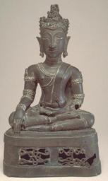 Keywords: Thai - Seated Crowned Buddha in "Maravijaya" - Walters 542747.jpg The overall shape and the treatment of the sockets is suggestive of a pan-Thai tendency observable in both Lan Na and Ayutthaya Nevertheless it is possible that the facial type had a long local history The re-emergence of the crowned Buddha as an iconic type is an important phenomenon It is the story of Jambupati that has been the central explanatory tradition within Thailand Perhaps the story was given new life in Lan Na around 1500 and then spread to other regions The casual freedom with which the decorative elements of the crown and base have been executed endowing this sculpture with considerable vivacity suggests a moment at the beginning of a tradition when the sculptors were not hamstrung by rules or expectations The 'S'-spirals and hooks are related in character to the decorative elements made of coiled lengths of clay and placed on the shoulder of stoneware jars early Other date century 16 Lan Na hollow cast leaded bronze at knees cm 23 3 12 accession number 54 2747 31650 Nakhon Kasem Bangkok Alexander B Griswold Monkton 1948 presented to the Breezewood Foundation 1965 inv no 549 Walters Art Museum Henry Walters Bequest of A B Griswold 1992 none Unearthly Elegance Buddhist Art from the Griswold Collection The Walters Art Gallery Baltimore 1995 place of origin Lan Na in present-day Thailand Walters Art Museum license Thai sculptures in the Walters Art Museum Art of Ancient Thailand Media contributed by the Walters Art Museum needs category review |