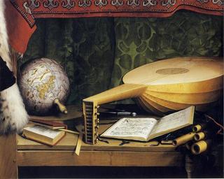 Keywords: The Ambassadors, detail of globe, lute, and books, by Hans Holbein the Younger.jpg Double Portrait of Jean de Dinteville and Georges de Selve called The Ambassadors technique oil tempera oak National Gallery London This lower shelf between the two ambassadors shows a terrestrial globe a lute a Lutheran hymn book an arithmetic book dividers and a bag of wooden flutes A theme of disharmony is suggested perhaps referring to the religious context of the ambassadors' mission the lute has a broken string the arithmetic book lies open on a division page and one of the flutes juts out from the rest Buck 98 Stephanie Buck Hans Holbein Cologne Könemann 1999 ISBN 3829025831 Creator Hans Holbein d J 1533 Museum National Gallery London 80px80px PD-old-100 Lutes in art Renaissance lutes Still-life paintings of musical instruments Details of The Ambassadors Holbein lute Broken Strings |