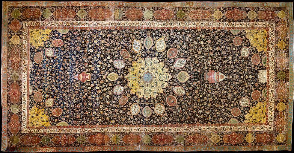 | Keywords: The Ardabil Carpet - Google Art Project.jpg 3490519 Unknown /collection/victoria-and-albert-museum/artwork/the-ardabil-carpet-unknown/3485540/ O54307 Unknown production /collection/victoria-and-albert-museum/ Victoria and Albert Museum 2572078 http //www vam ac uk/ 3/5/2012 2 44 00 PM /collection/victoria-and-albert-museum/artwork/the-ardabil-carpet-unknown/3485540/ 1534 ca 1539-1540 made 3485540 False 1543 1543 8/22/2012 12 17 06 PM 272-1893 http //collections vam ac uk/item/O54307 Carpet 1530 1550 country Iran The Islamic Republic of Iran Asia made ca 1539-1540 made - 1543 False 1 91760299625468 Object the-ardabil-carpet-unknown The Ardabil Carpet a Width 530 cm non-inscription end Width 529 5 cm middle Width 535 5 cm inscription end Length 1032 5 cm left side looking from inscription end Length 1044 cm middle Length 1031 cm right side looking from inscription end Hand knotted woollen pile on silk warp and weft; asymmetrical knot open to the left; average of 340 knots per sq in average of 5300 per sq dm stylized flowers; medallions special url_id AAG4cbGKXbWxeA PD-old-100 Google Art Project works by unknown artist Google Art Project files requiring license verification Ardabil Carpet |