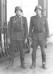 | Keywords: The Argentina soldiers in 1938.jpg  en This photo was taken in 1938 in a military barracks in Argentina The helmets are fiber parade versions in light green with decal on the right side not visible in the photograph The helmet is believed to me of Argentinean manufacture Note the two soldiers wear uniforms and equipment patterned after German standards ru А гентинские солдаты в «штальхельмах» в каза ме А гентина 1938 год http //www german-helmets com/FOREIGN 20USE 20HELMETS htm 1938 Diego A Godoy 1938 in Argentina Soldiers of Argentina Stahlhelm Military uniforms of Argentina Black and white photographs of Argentina Unidentified firearms PD-AR-Photo |