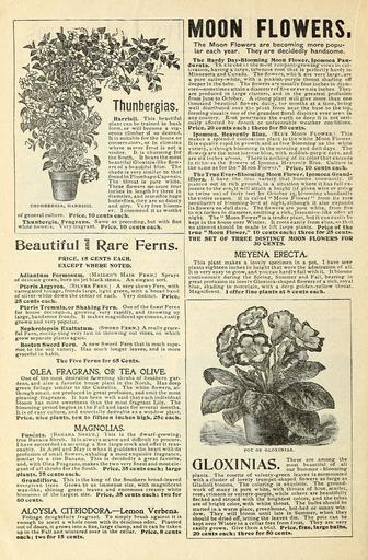 | Keywords: The best homes in America plant my flowers, why not you? (15769340373).jpg Thunbergias <br> Harrisii This beautiful <br> plant can be trained in bush <br> form or will become a vig- <br> orous climber if so desired <br> It is suitable for the house or <br> conservatory or in climates <br> where severe frost is not a <br> visitor It is charming for <br> the South It bears the most <br> beautiful Gloxinia-like flow- <br> ers of a beautiful blue The <br> shade is very similar to that <br> found in Plum bago Capensis <br> The throat is pure white <br> These flowers measure lour <br> inches in length by three in <br> diameter and resemble huge <br> butterflies they are so dainty <br> and airy Very free bloom- <br> er I commend it as worthy <br> of general culture Price 10 cents each <br> Thunbergia Fragrans Same as preceding but with fine <br> white noweis Very iragrant Price 10 cents each <br> THUNBERGIA HARRISII <br> Beautiful 1 Rare Ferns <br> PRICE 15 CENTS EACH <br> EXCEPT WHERE NOTED <br> Adiantuni Formosum Maiden's Hair Fern Sprays <br> of delicate green born on jet black stems An elegant sort <br> Pteris Argyrea Silver Fern A very showy Fern with <br> variegated loliagt fronds large light green with a broad band <br> of silver-white down the center of each Very distinct Price <br> 25 cents each <br> Pteris Tremula or Shaking Fern One of the finest Ferns <br> for house decoration growing very rapidly and throwing up <br> large handsome fronds It makes magnificent specimens easily <br> grown and very popular <br> Nephrolepsis Exaltatum Sword Fern A really grace- <br> ful Ftrn multip ying very last in throwing out vines on which <br> grow separate plants again <br> Boston Sword Fern A new Sword Fern that is much supe- <br> rior to the old variety Has much longer leaves and is more <br> graceful in habit <br> The Five Ferns for 65 Cents <br> GLEA FRAGRANS OR TEA OLIVE <br> One of the most desirable ftowering shrubs of Southern gar- <br> dens and also a favorite house plant in the North Has deep <br> green foliage similar to the Camellia The white flowers al- <br> though small are produced in great profusion and emit the most <br> pleasing fragrance It has been well said that each individual <br> bloom has more sweetness than the most fragrant Lily The <br> blooming period begins in the Fall and lasts for several months <br> It is of easy culture and esnecially desirable as a window plant <br> Price nice plants ten to fifteen inches high 25c each <br> MAGNOLIAS <br> Fuscata Banana Shrub This is the dwarf-growing <br> true Banana Shrub It is always scarce and difficult to procure <br> I have succeeded in securing a fine large stock and offer it reas- <br> onably In April and May is when it gladdens the heart with its <br> profusion of small flowers exhaling a most exquisite fragrance <br> similar to a rine Banana This is decidedly a great favorite <br> and with Olea Frag rans makes the two very finestand mostele- <br> gant of all shrubs for the South Price 35 cents each; large <br> plants 75 cents each <br> Grandif lora This is the king of the Southern broad-leaved <br> evergreen trees Grows to an immense size with magnificent <br> wax-like shining green leaves and enormous creamy white <br> blossoms of the largest size Price 35 cents each; two for <br> 60 cents <br> ALOYSIA CITRIODORA ” Lemon Verbena <br> Foliage delightfully fragrant To simply brush against it is <br> enough to scent a whole room with its delicious odor Planted <br> out of doors it grows into a fine large clump and it can be taken <br> up in the Fall and wintered over in the cellar Price 8 cents <br> each; two for 15 cents <br> MOON FLOWERS <br> The Moon Flowers are becoming more popu- <br> lar each year They are decidedly handsome <br> The Hardy Day-Blooming Moon Flower Ipomoea Pan- <br> durata Th s is one ul the most rampant-growing vines in cul- <br> tivation having a large tuherous root that is perfectly hardy in <br> Minnesota and Canada The flowers which are very large are <br> a pure satiny-white with a pinkish-purple throat shading off <br> deeper in the tube The flowers a'e usually four inches in diam- <br> eter ” sometimes attain a diameter of five or even six inches They <br> are produced in large clusters and in the greatest profusion <br> from June to October A s-trong plant will give more than one <br> thousand beautiful flowers daily for months at a time being <br> well distributed over tht plant from near the base to the top <br> forming usually one of the grandest floral displays ever seen in <br> any country Root penetrates the earth so deep it is not seri- <br> ously affected by drouth or unfavorable weather conditions <br> Price 20 cents each; three for 50 cents <br> Ipomoea Heavenly Blue Blue Moon Flower 1 This <br> makes a splendid companion plant to the white Moon Flower <br> It is equally rapid in growth and as free blooming as the white <br> variety although blooming in the morning and dull days The <br> flowers are the most intense blue with reddish-purp'e rays and <br> are six inchps across There is nothing of its colorthat exceeds <br> in richn- ss the flowers of Ipomcea Heavenly Blue Culture is <br> the same as for the Moon Flower Price 10 cents each <br> The True Ever-Blooming Moon Flower Ipomoea Grand- <br> iflora I have the true variety that blooms constantly If <br> planted out in rich ground in a situation where it has full ex- <br> posure to the sun it will attain a height if given wire or string <br> to twine on of forty feet bv Octoher 15 blooming abundantly <br> the entire season It is called Moon Flower from its rare <br> peculiaritv of blooming br«t at night although it also expands <br> its flowers on dull days The flowers are pure white from five <br> to six inches in diameter emitting a rich Tessamine-like odor at <br> night The Moon Power is a tender plant but it can easily be <br> kept in the house over Winter It roots easily from slips so that <br> no attempt 