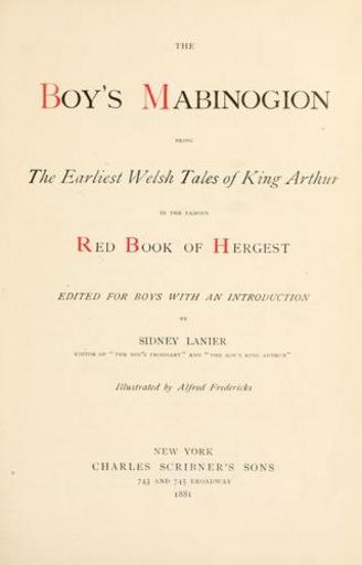 | Keywords: The Boy's Mabinogion - title page.jpg en Title page of The boy's Mabinogion being the earliest Welsh tales of King Arthur in the famous Red book of Hergest by Sidney Lanier New York 1881 Adaptations for children of some of the medieval Welsh Mabinogion stories cy Wynebddalen The boy's Mabinogion being the earliest Welsh tales of King Arthur in the famous Red book of Hergest gan Sidney Lanier Efrog Newydd 1881 Addasiadau ar gyfer plant o rai o chwedlau'r Mabinogion scan of title page sourced from http //covers openlibrary org/b/id/5917600-L jpg openlibrary org Sidney Lanier 1881 Source http //covers openlibrary org/b/id/5917600-L jpg openlibrary org 1881 PD-old-70 1881 books Title pages from the United States Children's book pages Mabinogion Red Book of Hergest Title pages in English Sidney Lanier |