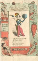 | Keywords: library company of philadelphia librarycompanyofphiladelphia united states unitedstates history civil war civilwar 1861-1865 18611865 soldiers cartoons wit humor drawing text writing sketch painting illustration cartoon The first line quotes from Charles Carroll Sawyer's sentimental Civil War ballad, "When this cruel war is over." The valentine shows a Union soldier lighting his cigarette from a bomb as bombs fly in the background behind him. The border features matches, a heart-shaped beet, and cherubs playing tennis and tug o' war. The label on the matchbox reads "Red-headed matches go off easy," and the beet is marked "D.B." [i.e. "dead beat" or "dead beet"]. The first line quotes from Charles Carroll Sawyer's sentimental Civil War ballad, "When this cruel war is over." The valentine shows a Union soldier lighting his cigarette from a bomb as bombs fly in the background behind him. The border features matches, a heart-shaped beet, and cherubs playing tennis and tug o' war. The label on the matchbox reads "Red-headed matches go off easy," and the beet is marked "D.B." [i.e. "dead beat" or "dead beet"].  |