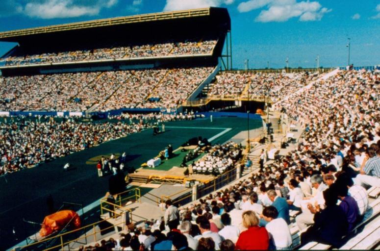Keywords: mennonite world conference mennoniteworldconference winnipeg manitoba canada outdoor Caption: When we negotiated the rental of the stadium for this Sunday service, we were told in no uncertain terms that the policy of Winnipeg Enterprizes would not allow the audience to congregate on the turf. So we planned for everybody to be seated in the east, west and north stands, or on the south end grass. Soon, though the cold winds on the east side drove them down to the more sheltered and warmer turf area. We could not stop them. Our friend, the Stadium Operations Manager, Rod Thiessen, first closed one eye, then both, and we let it happen. Eventually a mass of people on the turf formed a bridge between the widely separated stands. We had physically become one. But even more significantly, we had through the week and on this Sunday morning become one in the Spirit. I was reminded of the song we sang in 1984 at Strasbourg: "In Christ there is no East or West, in Him no South or North; But one great fellowship of love Throughout the whole wide earth. In Him shall true hearts everywhere There high communion find His service is the golden cord Close binding all mankind." Citation: Mennonite World Conference. Twelfth Mennonite World Conference, 1990, Winnipeg, Canada. Slides by T. Klassen; Script by John Dyck. X-9 Box 52 Folder 4 Slide 136. Mennonite Church USA Archives - Goshen. Goshen, Indiana. Caption: When we negotiated the rental of the stadium for this Sunday service, we were told in no uncertain terms that the policy of Winnipeg Enterprizes would not allow the audience to congregate on the turf. So we planned for everybody to be seated in the east, west and north stands, or on the south end grass. Soon, though the cold winds on the east side drove them down to the more sheltered and warmer turf area. We could not stop them. Our friend, the Stadium Operations Manager, Rod Thiessen, first closed one eye, then both, and we let it happen. Eventually a mass of people on the turf formed a bridge between the widely separated stands. We had physically become one. But even more significantly, we had through the week and on this Sunday morning become one in the Spirit. I was reminded of the song we sang in 1984 at Strasbourg: "In Christ there is no East or West, in Him no South or North; But one great fellowship of love Throughout the whole wide earth. In Him shall true hearts everywhere There high communion find His service is the golden cord Close binding all mankind." Citation: Mennonite World Conference. Twelfth Mennonite World Conference, 1990, Winnipeg, Canada. Slides by T. Klassen; Script by John Dyck. X-9 Box 52 Folder 4 Slide 136. Mennonite Church USA Archives - Goshen. Goshen, Indiana. |