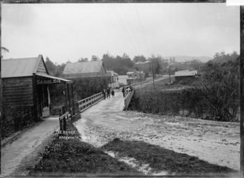 Keywords: blackandwhite monochrome outdoor black and white The township of Warkworth, circa 1910. Shows a bridge and people standing on it. Some are looking at the photographer and others are looking over the side to the falls below. The premises of Thomas Walker, saddler, are on the left in the foreground. Photograph taken by William A Price. Inscriptions: Inscribed - Photographer's title on negative -bottom left: The Bridge. Warkworth. Quantity: 1 b&w original negative(s). Physical Description: Dry plate glass negative 4.75 x 6.5 inches The bridge at Warkworth. Price, William Archer, 1866-1948 :Collection of post card negatives. Ref: 1/2-001799-G. Alexander Turnbull Library, Wellington, New Zealand. natlib.govt.nz/records/22778800 The township of Warkworth, circa 1910. Shows a bridge and people standing on it. Some are looking at the photographer and others are looking over the side to the falls below. The premises of Thomas Walker, saddler, are on the left in the foreground. Photograph taken by William A Price. Inscriptions: Inscribed - Photographer's title on negative -bottom left: The Bridge. Warkworth. Quantity: 1 b&w original negative(s). Physical Description: Dry plate glass negative 4.75 x 6.5 inches The bridge at Warkworth. Price, William Archer, 1866-1948 :Collection of post card negatives. Ref: 1/2-001799-G. Alexander Turnbull Library, Wellington, New Zealand. natlib.govt.nz/records/22778800 |