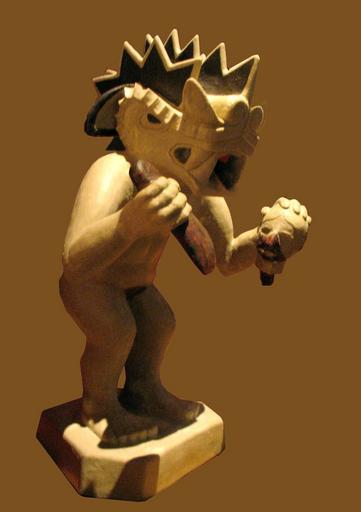 Keywords: The Decapitator.jpg A reproduction of a Moche statue on display at the Army Museum in Stockholm The translation of the caption in the background is as follows THE DECAPITATOR A ferocious mythological being from the Moche culture in Peru c 500 BC In his right hand he is holding a tumi “ a ritual sacrificial knife At the top of Moche society reigned warrior-priests who presided over sacrificial ceremonies where prisoners of war were decapitated and cut up after which their blood was greedily drunk The Moche people possessed no writing system but their artwork is unparalleled in pre-Columbian America In the 8th century AD the culture disappeared without explanation Sculpture after a contemporary clay vessel from Peru 2007-07-04 Peter Isotalo The Decapitator Moche jpg Moche pottery Beheadings in art Collections of the Swedish Army Museum |