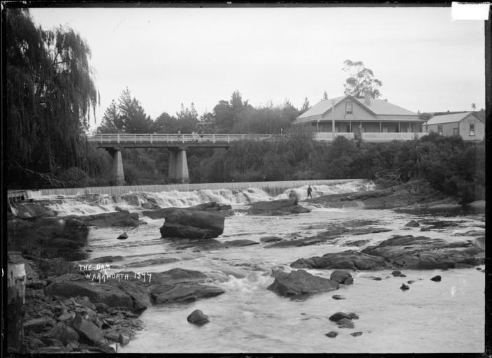 | Keywords: blackandwhite monochrome outdoor photo border black and white Shows the Warkworth dam and falls on the Mahurangi River, and the bridge crossing the river. In the background, at the end of the bridge, is a dwelling, and a billiard room to the right. There is a small group of people standing on the bridge and a boy standing on the rocks near the dam. Photograph taken by William A Price, ca 1910. Inscriptions: Inscribed - Photographer's title on negative -bottom left: The dam. Warkworth. 1377.. Quantity: 1 b&w original negative(s). Physical Description: Dry plate glass negative 4.75 x 6.5 inches The falls and bridge at Warkworth. Price, William Archer, 1866-1948 :Collection of post card negatives. Ref: 1/2-000592-G. Alexander Turnbull Library, Wellington, New Zealand. natlib.govt.nz/records/23037609 Shows the Warkworth dam and falls on the Mahurangi River, and the bridge crossing the river. In the background, at the end of the bridge, is a dwelling, and a billiard room to the right. There is a small group of people standing on the bridge and a boy standing on the rocks near the dam. Photograph taken by William A Price, ca 1910. Inscriptions: Inscribed - Photographer's title on negative -bottom left: The dam. Warkworth. 1377.. Quantity: 1 b&w original negative(s). Physical Description: Dry plate glass negative 4.75 x 6.5 inches The falls and bridge at Warkworth. Price, William Archer, 1866-1948 :Collection of post card negatives. Ref: 1/2-000592-G. Alexander Turnbull Library, Wellington, New Zealand. natlib.govt.nz/records/23037609 |